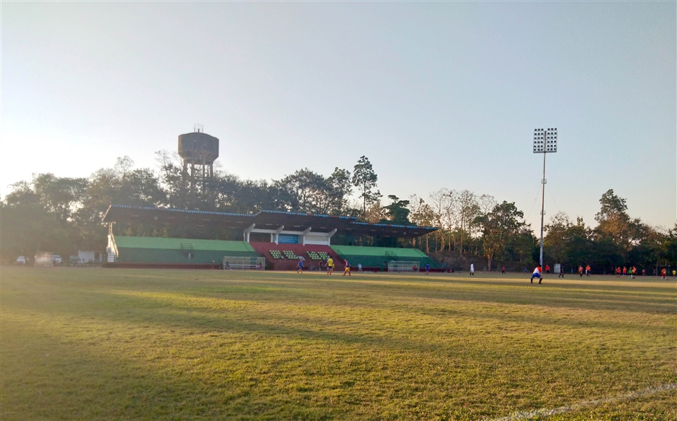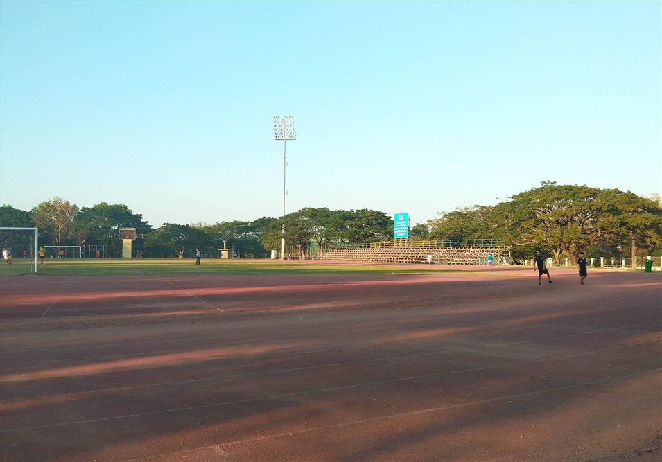老撾國立大學的同學就很喜歡踢足球,足球場在學校的東面,球場正面是主席臺,側(cè)面還設(shè)有一處看臺,大約可以容納270名觀眾。跑道一圈也是400米,占地面積很大。球場中間的草是真草,有專門的人員養(yǎng)護。