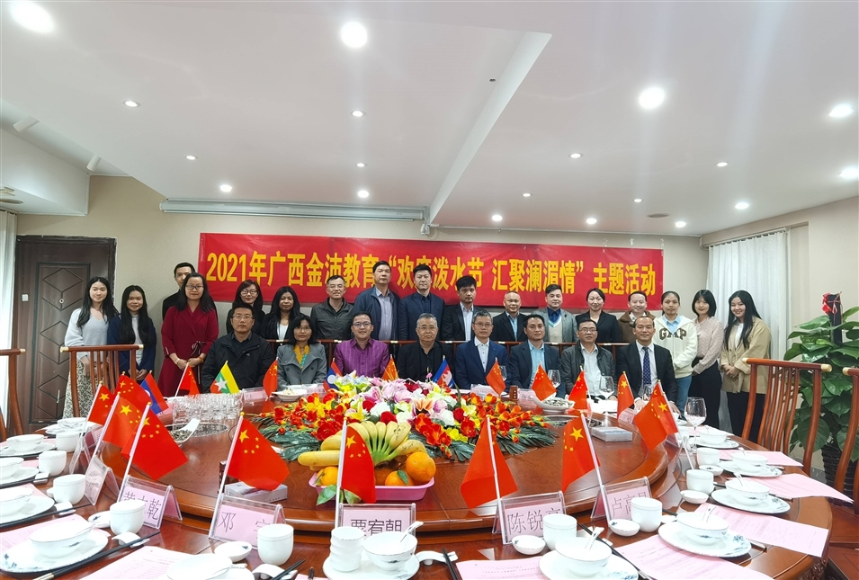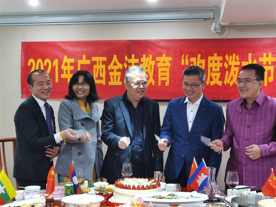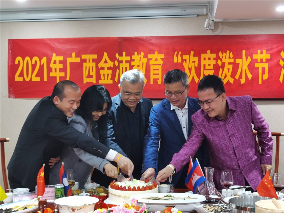 (老撾駐南寧總領(lǐng)事館總領(lǐng)事維拉薩宋蓬先生、柬埔寨駐南寧總領(lǐng)事館領(lǐng)事龍瓦塔納先生、緬甸駐南寧總領(lǐng)事館領(lǐng)事佳吉文女士、致公黨廣西區(qū)委秘書長(zhǎng)兼辦公室主任李永政先生、廣西金沛教育執(zhí)行董事粟宥朝先生共切潑水節(jié)及中國(guó)共產(chǎn)黨成立100周年蛋糕)