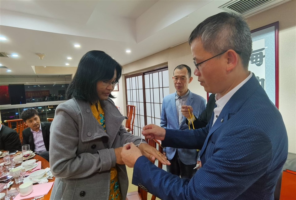 (廣西金沛教育執(zhí)行董事粟宥朝先生為柬埔寨駐南寧總領(lǐng)事館領(lǐng)事龍瓦塔納先生栓線禮節(jié))