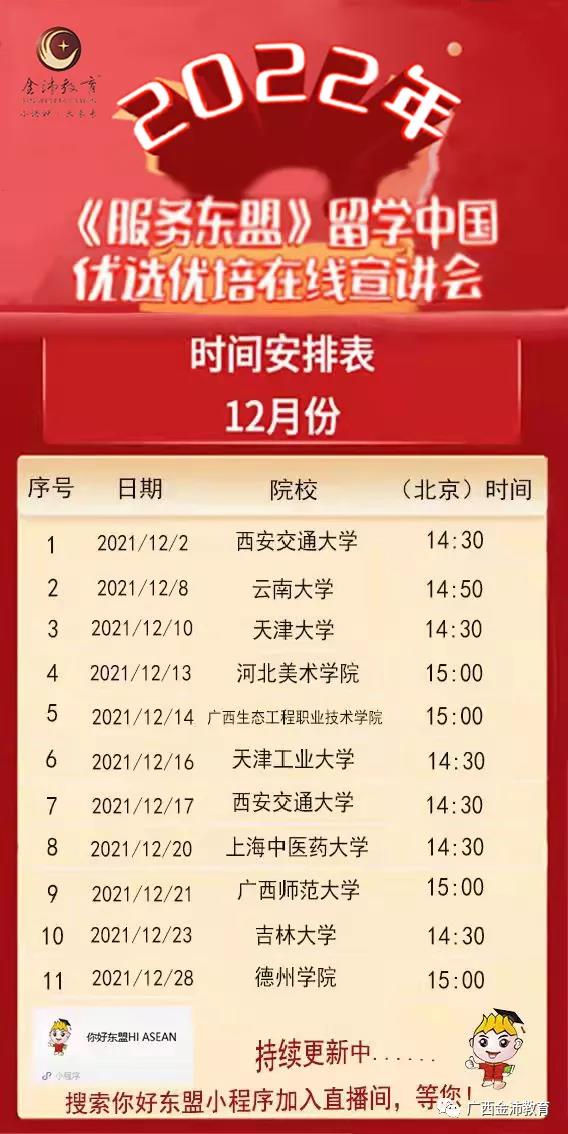 2021122日起,由我司聯(lián)合多所高校開展的“2022年留學中國優(yōu)選優(yōu)培線上直播宣講會將積極利用直播新形勢在你好東盟微信小程序上進行開播。學校和師生、家長可通過小程序你好東盟、FacebookYoutube直播等多種途徑收看本次宣講會。