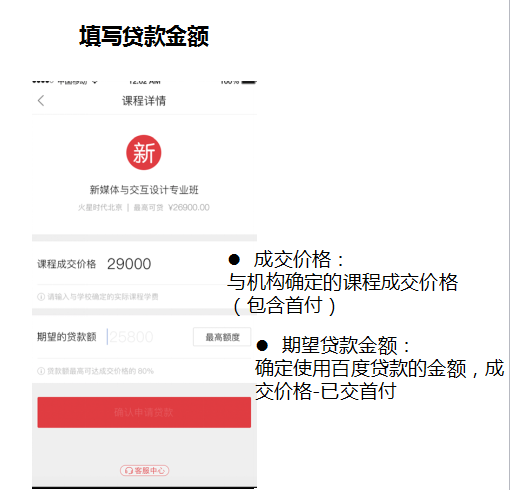 方式三:通過門店選定課程,填寫貸款金額【成交價格:與機(jī)構(gòu)確定的課程成交價格(包含首付);期望貸款金額:確定使用百度貸款的金額,成交價格-已交首付】