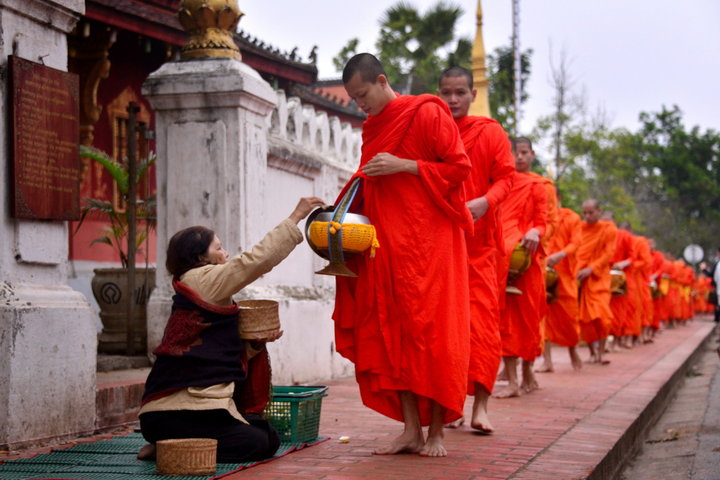 在老撾的許多地方,布施是一道獨(dú)特的風(fēng)景。每天拂曉,僧人們會離開寺院,身披橙色袈裟,結(jié)隊到街道上或村莊里化齋。虔誠的佛教徒跪在道路的一邊,雙掌合十,接受僧侶誦經(jīng)祝福。誦經(jīng)完畢,僧侶們排著隊伍依次從人們的面前赤腳行過,人們把米飯、餅干、水果、雞肉等食物放進(jìn)僧人們的竹編小籃中。這些食品,就是僧人們一天的口糧。