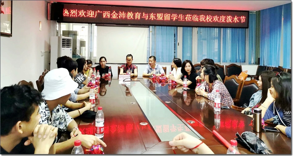 南寧市第十五中學(xué)盧副校長(zhǎng)及譚主任親自到校門迎接并在會(huì)議室熱情接待了大家。在歡迎會(huì)上,盧副校長(zhǎng)向東盟各國(guó)留學(xué)生介紹了學(xué)校概況并送上壯族特色的繡球表示歡迎。南寧市第十五中學(xué)是東盟文化相融合的特色高中,至此高考來臨之際,為增進(jìn)師生互動(dòng),緩解高三學(xué)子的考試壓力,學(xué)校以東盟特色的潑水方式傳遞祝福、共同祈愿,同時(shí)也為中國(guó)學(xué)生與留學(xué)生提供了一個(gè)文化交流平臺(tái)。