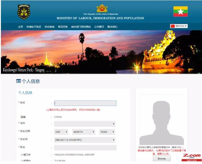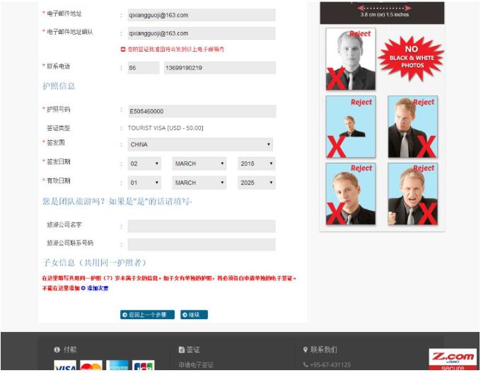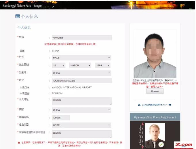 這是頁(yè)面的上半部分;比較簡(jiǎn)單;名字;國(guó)籍;性別,出生日期;出生地,職業(yè),這些都按照護(hù)照的信息填寫;常駐家庭地址;國(guó)家;郵編;在緬甸的入住酒店的類型;酒店,公寓,快捷酒店;之類的選擇;酒店的名稱;還沒(méi)有預(yù)定的話,就可以上網(wǎng)預(yù)定一個(gè)可以取消的那種;很多網(wǎng)站都可以在一定時(shí)間內(nèi)取消酒店;預(yù)定一個(gè),這些酒店信息就都有了;注意,照片不能大于2M哦;