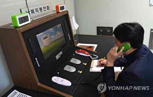 當(dāng)?shù)貢r(shí)間1月3日下午3點(diǎn)34分,在板門店聯(lián)合警備區(qū)聯(lián)絡(luò)事務(wù)所,韓方聯(lián)絡(luò)官拿起韓朝直通電話的話筒與朝方通話。(圖片來源:韓聯(lián)社)