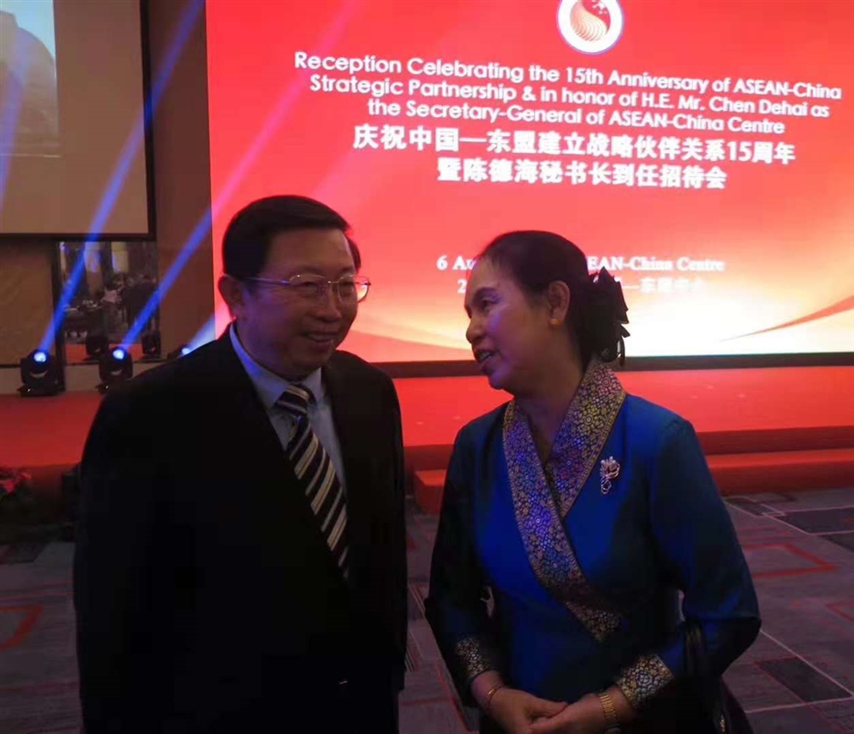 2018年8月,在中國—東盟建立戰(zhàn)略伙伴關系15周年招待會上,許寧寧與老撾駐華大使交談。