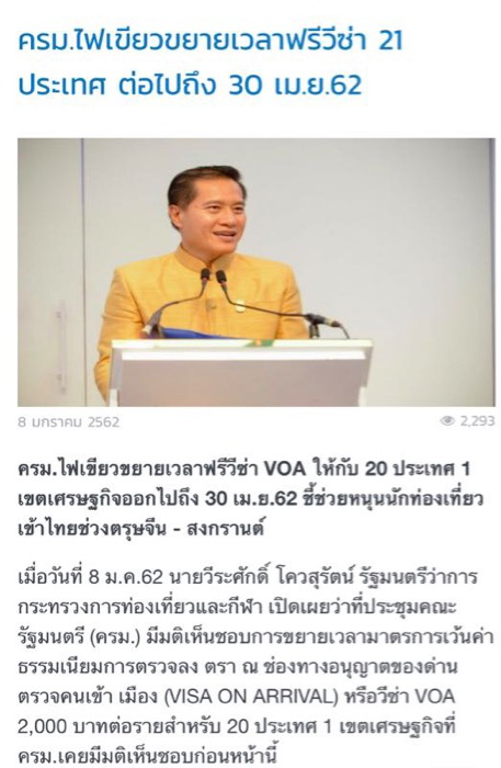 新京報(bào)訊(記者 王勝男)據(jù)泰國媒體《曼谷商業(yè)新聞》、《曼谷郵報(bào)》等報(bào)道,1月8日,泰國旅游與體育部長威拉薩在內(nèi)閣會(huì)議結(jié)束后宣布,為刺激泰國旅游,泰國內(nèi)閣通過了將免除泰國落地簽證費(fèi)政策延長3個(gè)月至2019年4月30日的提案,并表示落地簽免費(fèi)政策的延長將促使春節(jié)和泰國潑水節(jié)期間的來泰旅客人數(shù)增加。目前此項(xiàng)法案還需經(jīng)泰國王室公報(bào)公告才能生效。