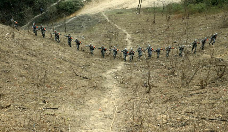掃雷官兵手拉手走過(guò)完成清理的中越邊境廣西段某雷場(chǎng)(12月22日攝)。為了讓百姓放心,向地方政府交付雷場(chǎng)時(shí),掃雷官兵將手拉手在作業(yè)完的雷場(chǎng)上來(lái)回走幾遍。 11月27日,中越邊境廣西段新一輪掃雷行動(dòng)全面啟動(dòng)。此次行動(dòng)的主要任務(wù)是徹底掃除和封圍廣西邊境附近53處共計(jì)約205萬(wàn)平方米的雷場(chǎng)。12月22日,記者隨南部戰(zhàn)區(qū)陸軍廣西西線掃雷隊(duì),前往中越邊境某雷場(chǎng),用照片紀(jì)錄排雷官兵清理雷區(qū)的驚險(xiǎn)過(guò)程。
